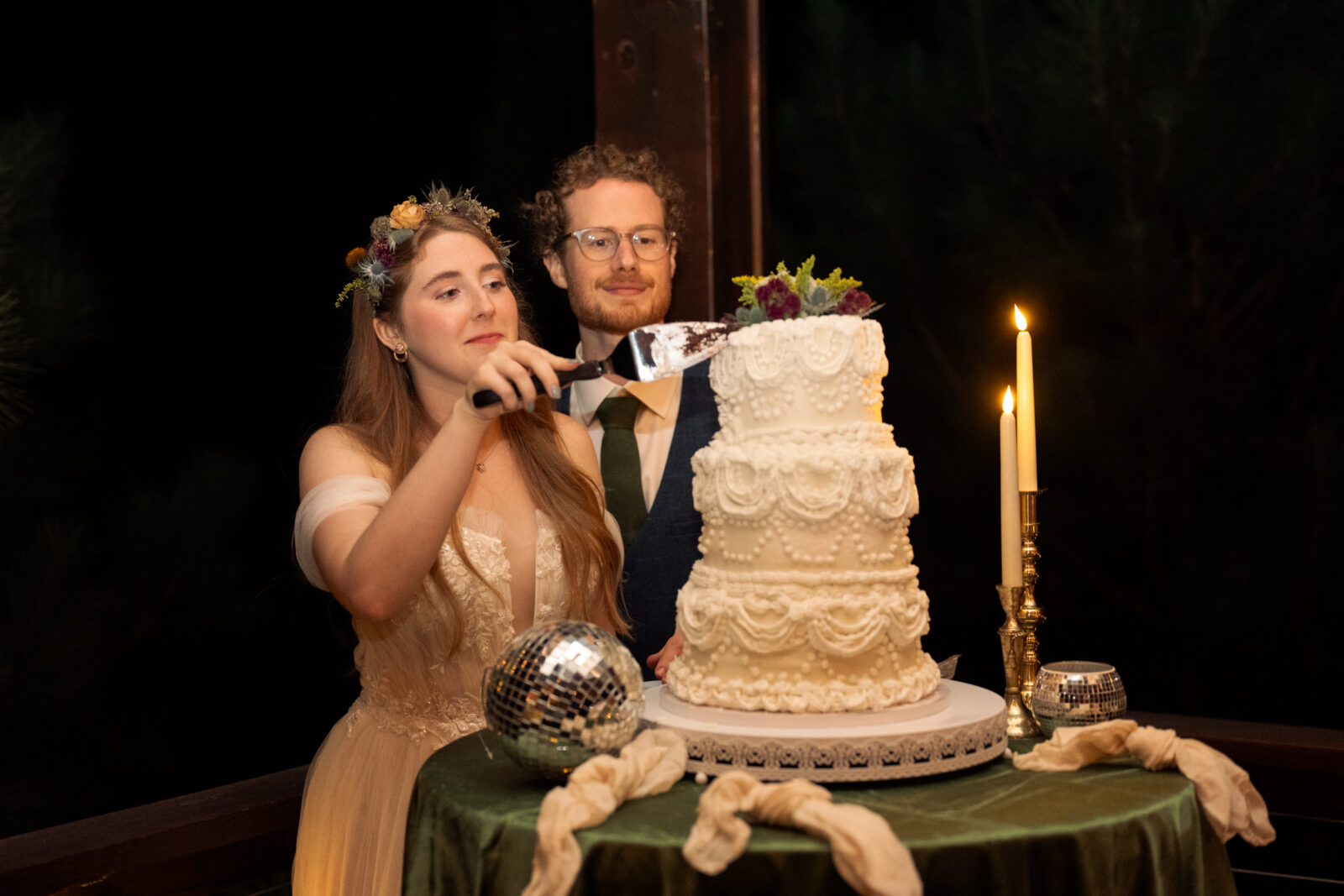 I think that’s my favorite aspect of Landann and Matthew’s wedding in Cadiz. They rented out Nine Pines Retreats and got ready in the cutest tents. Then they joined their family and friends for the most beautiful ceremony in the woods. I love the colors they chose. I still dream about Landann’s bouquet. I’ll never forget the combination of birds and disco balls for their centerpieces, or the handmade handkerchiefs for happy tears.